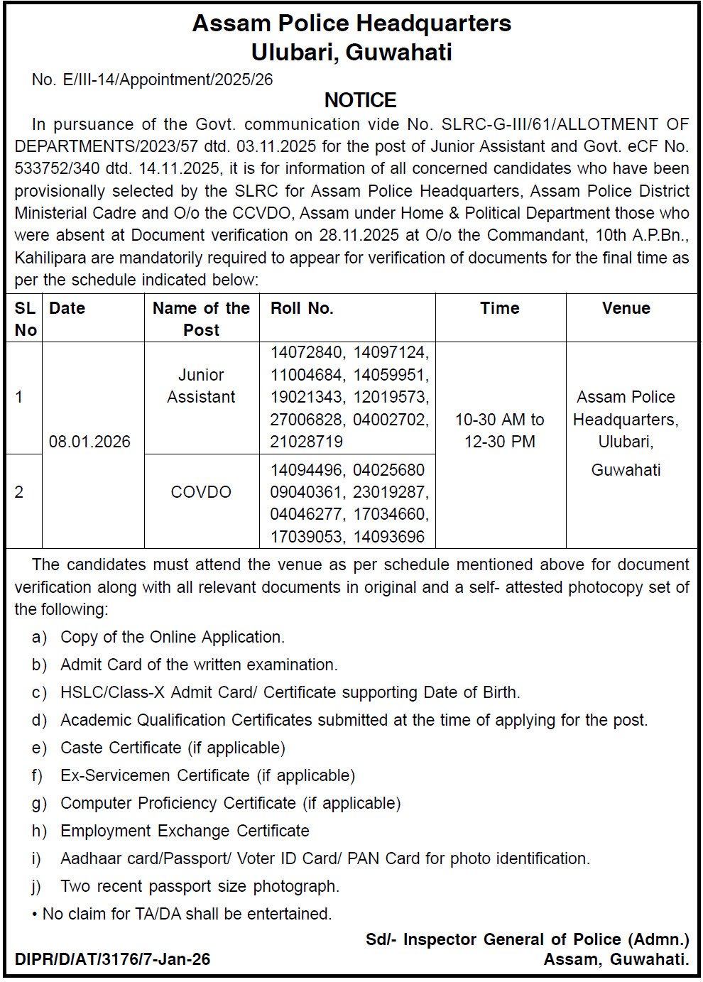 This notification is specifically for candidates selected for the posts of Junior Assistant and COVDO (Computer Operator) under the Assam Police Headquarters and District Ministerial Cadre who were absent during the previous verification drive held on 28th November 2025.
