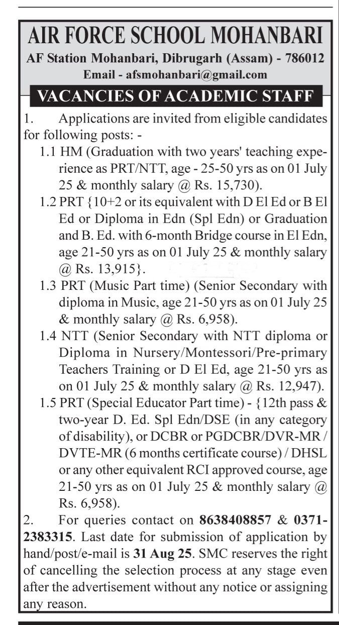 The Air Force School Mohanbari, Assam, has invited applications for the recruitment of academic staff, offering various government job opportunities in 2025. Announced on August 15, 2025, at 04:30 PM IST, this recruitment drive includes posts such as Headmistress (HM), Primary Teacher (PRT), Nursery Teacher (NTT), and Special Educator, with a last date of August 31, 2025, for applications. This SEO-optimized article provides a detailed guide on eligibility, application process, and key dates.