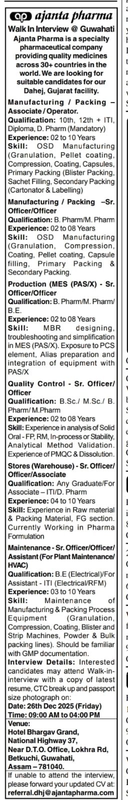 Ajanta Pharma Recruitment 2025:: Ajanta Pharma Ltd., a renowned specialty pharmaceutical company with a robust global presence in over 30 countries, has announced a massive recruitment drive for the year 2025. The company is conducting a Walk-in Interview in Guwahati, Assam, to hire skilled professionals for its state-of-the-art manufacturing facility in Dahej, Gujarat.