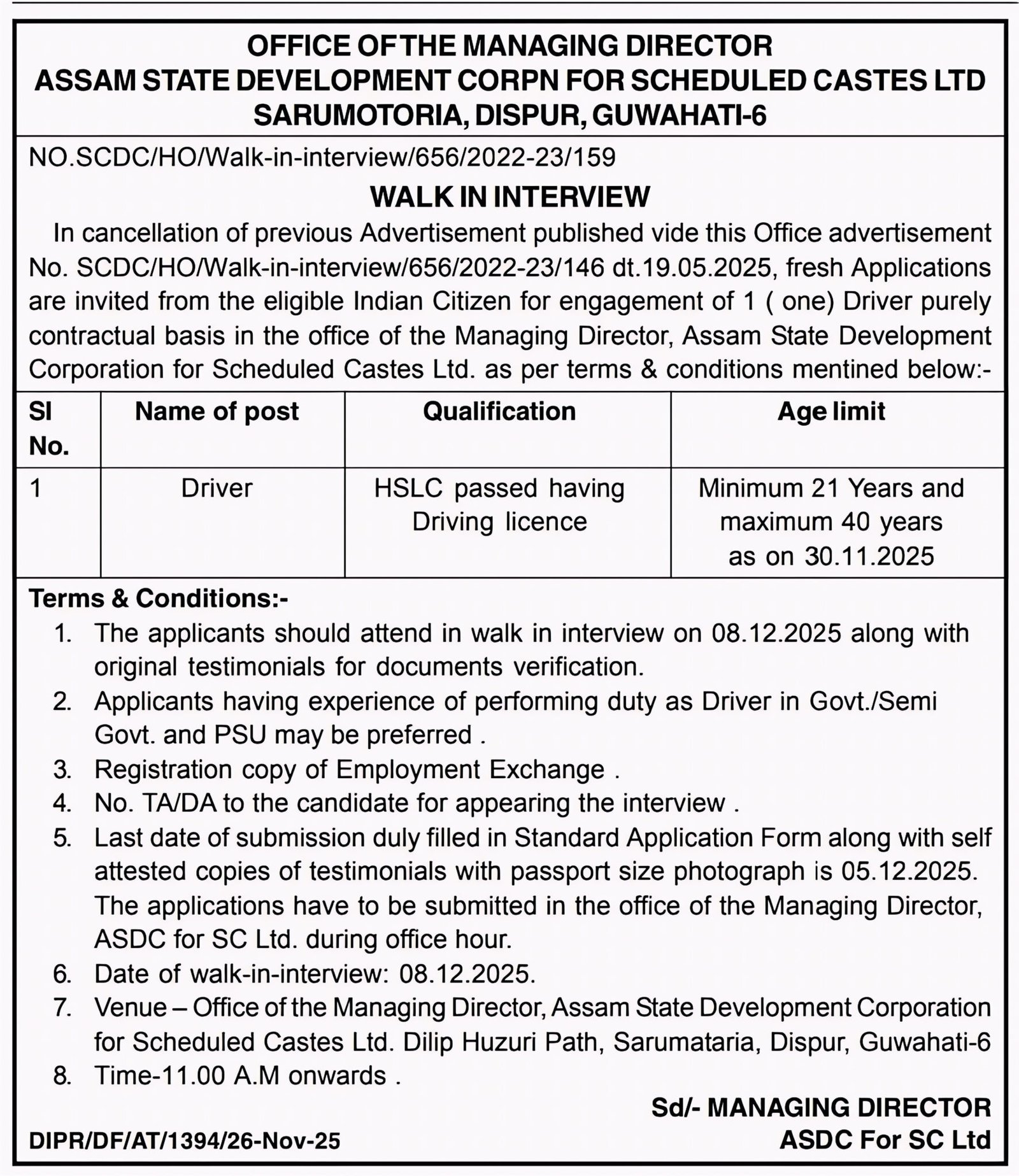 Assam State Development Corporation for Scheduled Castes Ltd invites eligible candidates for Driver post – Apply & appear for interview
