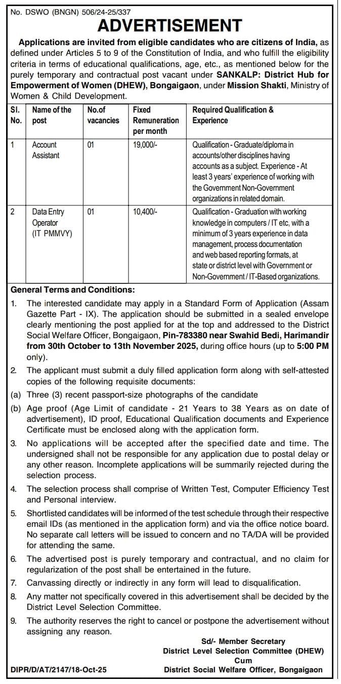 District Hub for Empowerment of Women (DHEW), Bongaigaon has announced recruitment for 2 contractual posts under Mission Shakti. Apply offline before 13th November 2025.