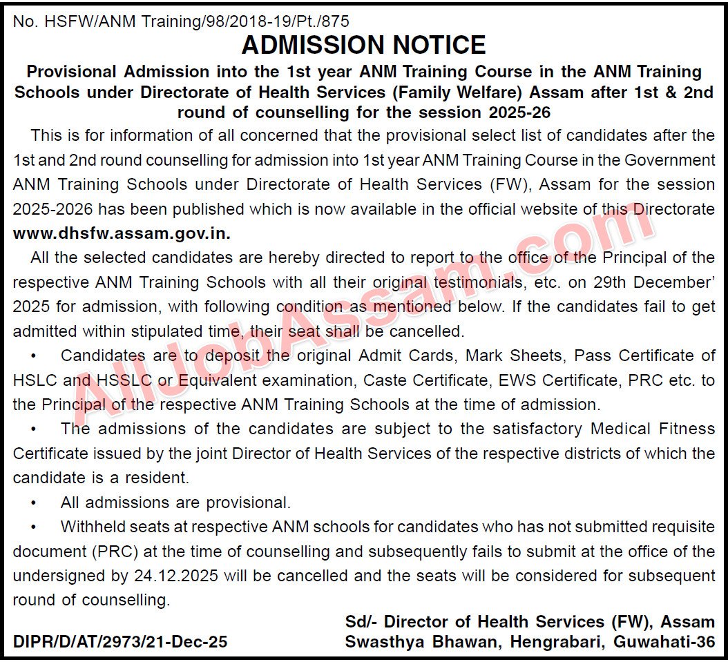 DHSFW Assam ANM Admission 2025: The Directorate of Health Services (Family Welfare), Assam, has officially released the Provisional Select List for candidates selected for the 1st Year Auxiliary Nurse Midwife (ANM) Training Course for the academic session 2025-2026. This selection list has been prepared following the completion of the 1st and 2nd rounds of counseling.