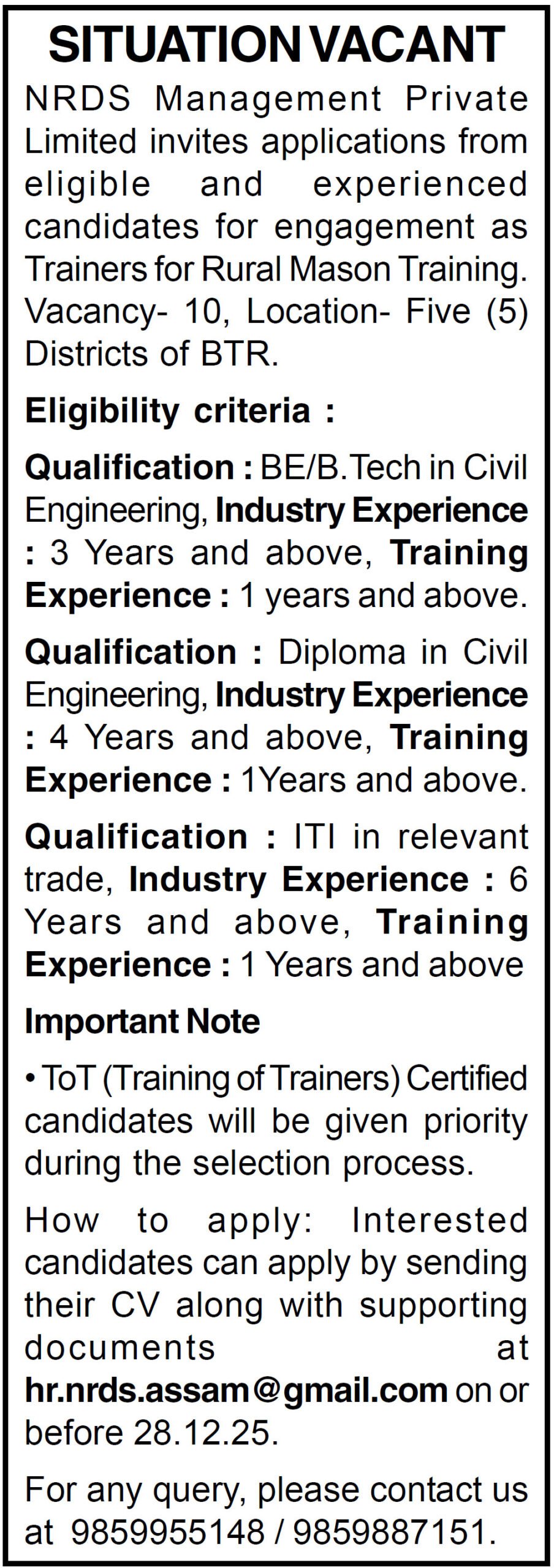 NRDS Management Recruitment 2025: BTRNRDS Management Private Limited, a reputed management organization, has released an official employment notification inviting applications from eligible and experienced candidates. The organization is looking to recruit dedicated professionals for engagement asย Trainers for Rural Mason Training.