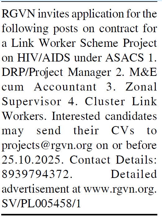 Rashtriya Gramin Vikas Nidhi (RGVN) has announced recruitment for various contractual positions under the Link Worker Scheme on HIV/AIDS, supported by Assam State AIDS Control Society (ASACS). The organization invites eligible candidates to apply for different posts on or before 25th October 2025.