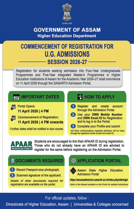 With the introduction of the SAMARTH Portal, the Government of Assam has simplified the college admission process, making it more transparent, efficient, and student-friendly. Candidates who have completed their Higher Secondary (HS) examination or equivalent can now apply online from 11 April 2026.
