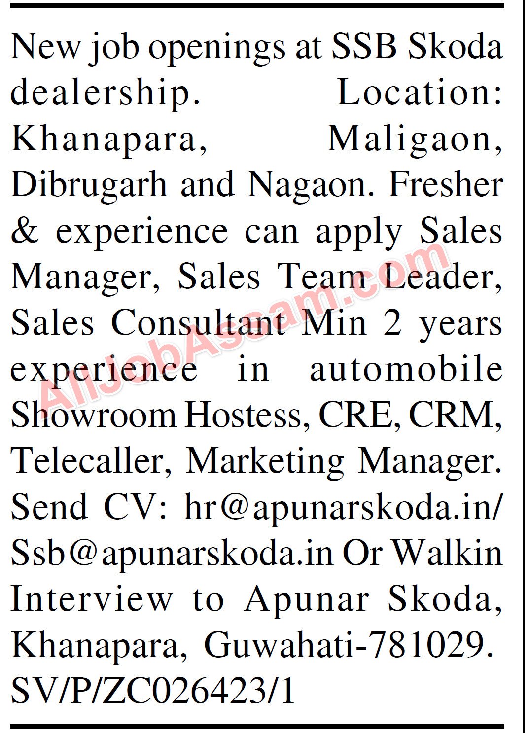 - Sales Consultant: Requirement: Minimum 2 years of experience in the automobile sector.