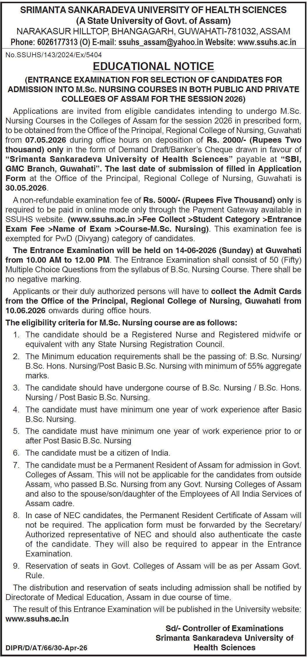 The Srimanta Sankaradeva University of Health Sciences (SSUHS) has officially released the Educational Notice for M.Sc Nursing Admission 2026. This entrance examination is conducted for admission into M.Sc Nursing courses in both Government and Private Colleges across Assam for the academic session 2026.