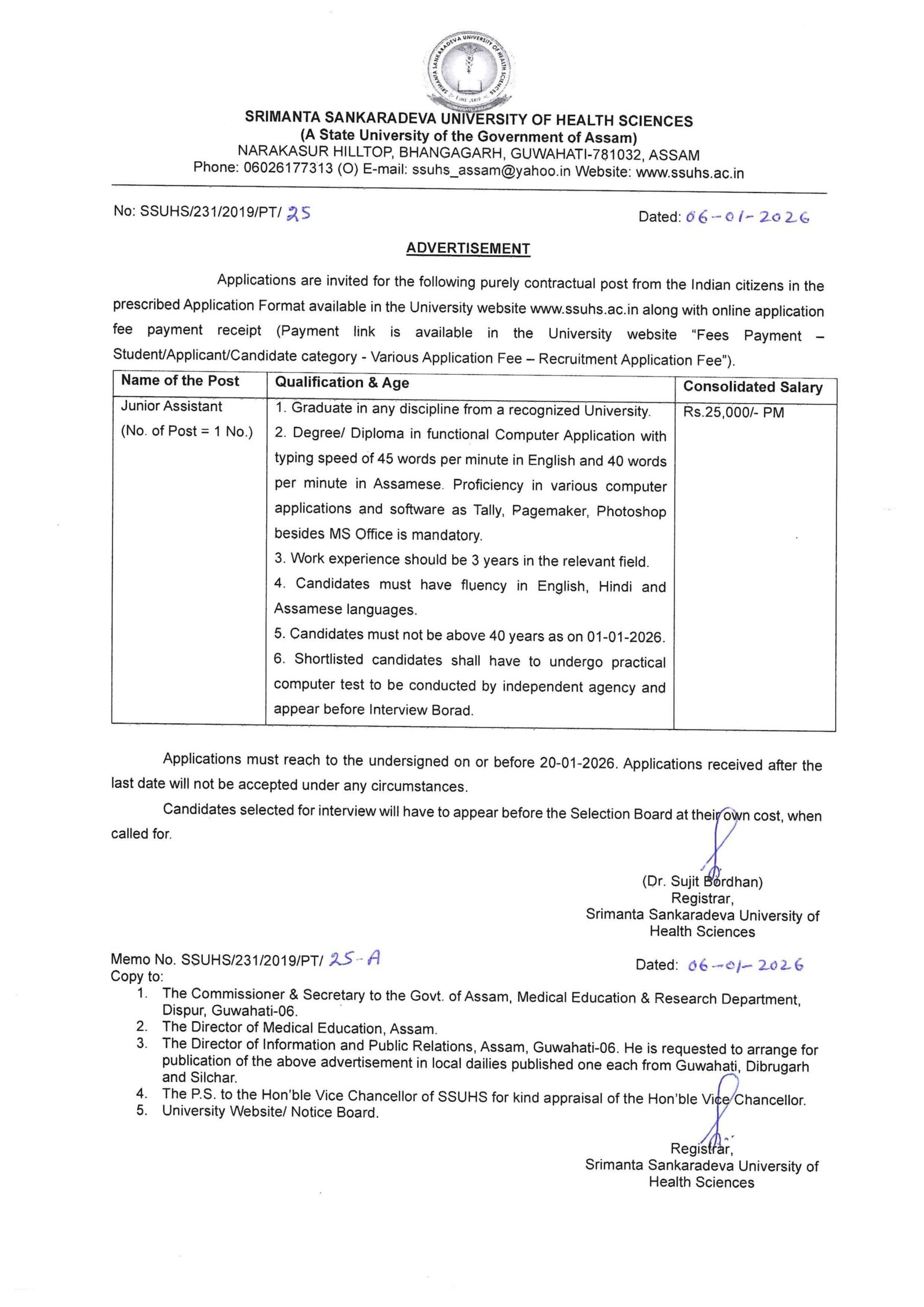 SSUHS Recruitment 2026: The Srimanta Sankaradeva University of Health Sciences (SSUHS), located in Bhangagarh, Guwahati, has released an official employment notification inviting applications from eligible Indian citizens. The university is looking to recruit a qualified candidate for the post of Junior Assistant on a purely contractual basis.