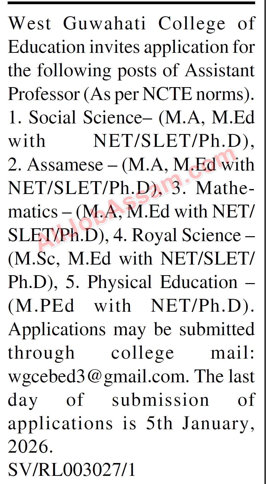 West Guwahati College of Education Recruitment 2026: West Guwahati College of Education, located in Templeghat, Pandu (Guwahati), has released an official recruitment notification inviting applications from qualified and experienced candidates. The college is looking to fill several positions for Assistant Professors across various disciplines in accordance with NCTE norms.